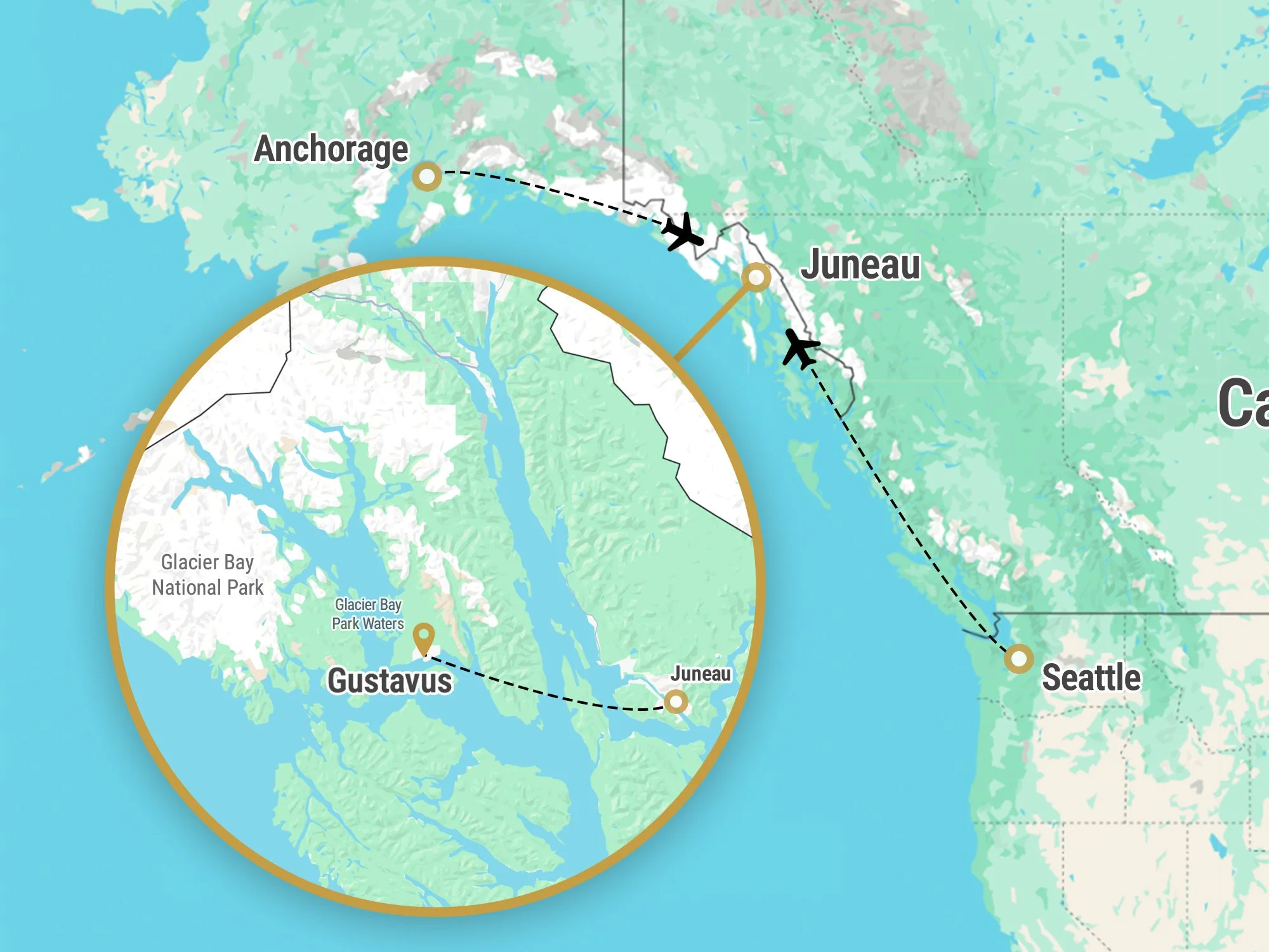 Please note: an overnight stay in either Juneau or Seattle may be required on the return leg of your trip. Just ask us any questions and we will help you coordinate travel.